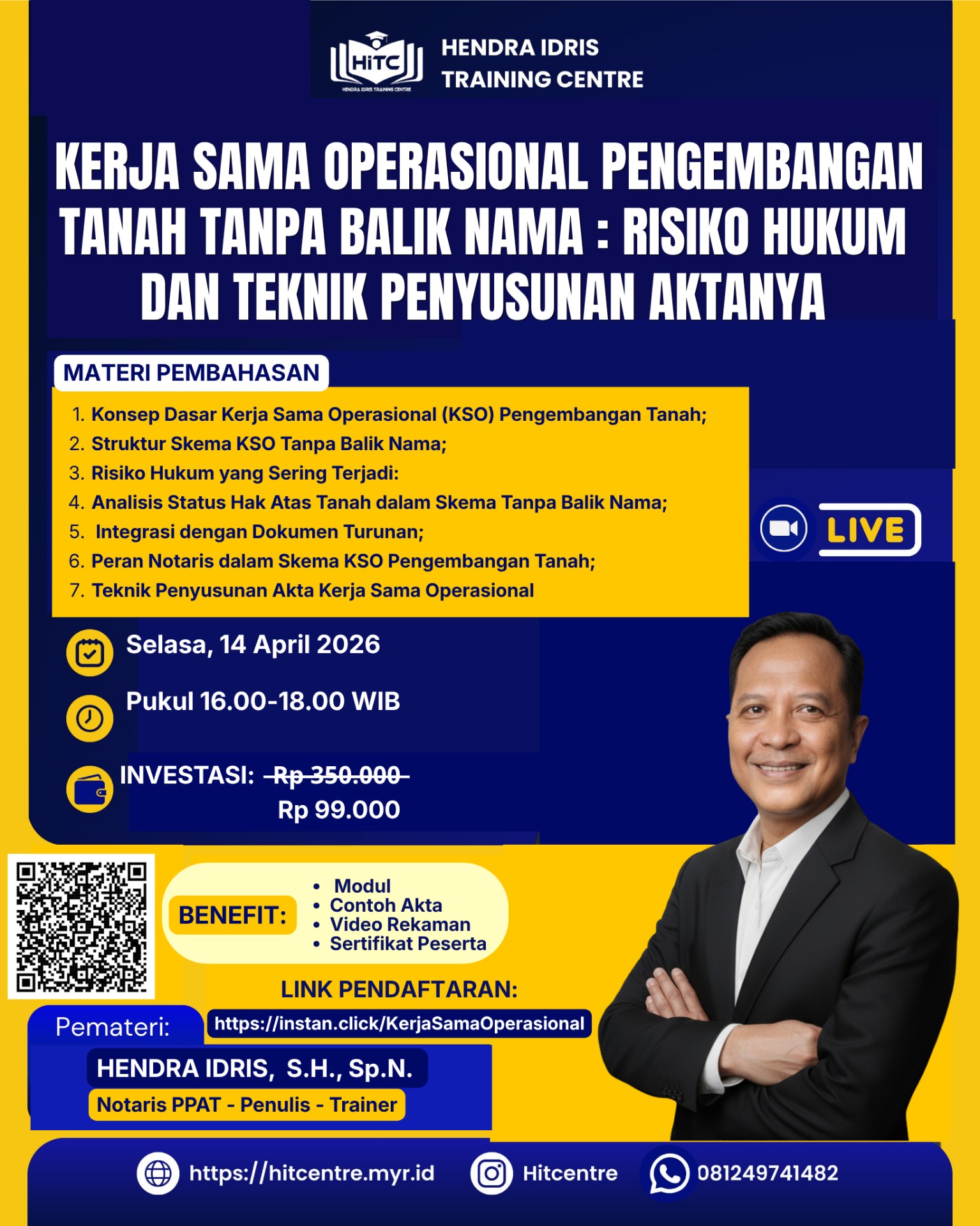 4. Kerja Sama Operasional Pengembangan Tanah Tanpa Balik Nama: Risiko Hukum dan Teknik Penyusunan Aktanya, Diselenggarakan pada hari Selasa, 14 April 2026;