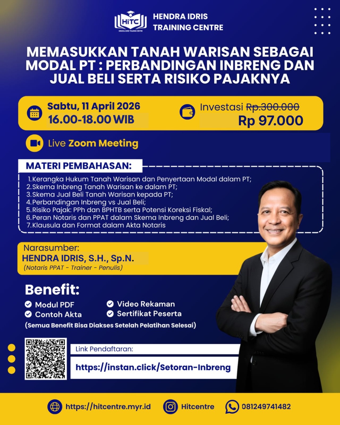 3. Memasukkan Tanah Warisan sebagai Modal PT: Perbandingan Inbreng dan Jual Beli serta Risiko Pajaknya, Diselenggarakan pada hari Sabtu, 11 April 2026;